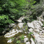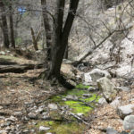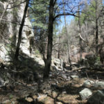 Continuing up the canyon, I finally emerged into a stretch with more exposed bedrock and clearer running water. I came upon a crumpled piece of toilet paper on the trail, and continuing, saw a scatter of toilet paper on the ground at the foot of rock outcrops above the trail. These recent hikers were truly jerks, failing to carry out their paper waste, leaving it to be scattered by animals and found by later visitors.
