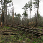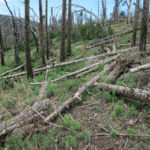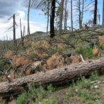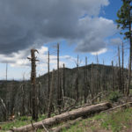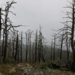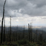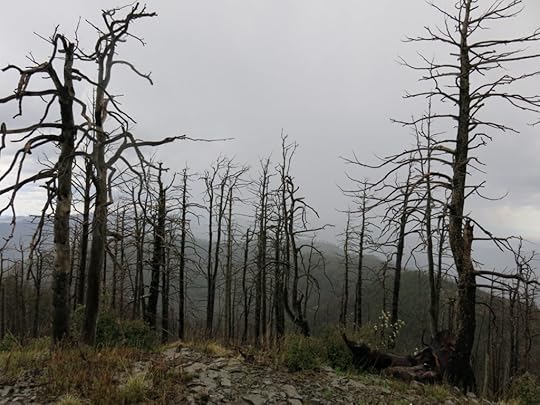 Deep soil remains on these mountains from the pre-fire alpine forest, and rainwater was pouring down the slopes in a sheet flow, turning the soil into a continuous bog. And on top of that, the slopes are an obstacle course of fallen logs, many of which are so big you have to zigzag back and forth to avoid them. When I finally slogged my way to the top, where the view is blocked by spectral snags, my feet and lower pant legs were completely soaked. And I could see through the ghost forest on the north side that my return route lay under an even heavier storm.