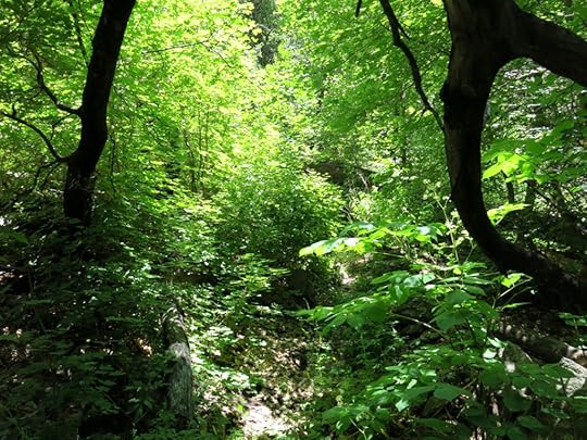 Beyond the cabin the trail continued to follow an old road, back and forth across the algae-choked creek and its trampled, overgrazed banks, until it finally began to climb a steep, rocky slope and narrowed into a real hiking trail again. The footprints of three other recent hikers continued there, but they were dominated by the hoofprints of cattle.