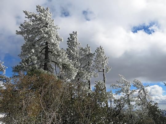 The forecast called for up to 4 inches of snow, beginning in early morning, so I was looking forward to today’s hike. But 4 inches in town, at 6,000′, could translate to a foot in the mountains. So I’d decided to try one of my favorite hikes, over in Arizona, which starts over a thousand feet lower and climbs to a little below 9,000′. I didn’t know if I’d make it to the top, but I’d try.