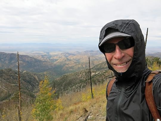 I dropped my pack and hauled out my sweater, windbreaker, and knit cap, and packed away my straw shade hat. The cloud cover was nearly complete, air temperature was probably in the 50s, and wind chill brutal, but I was now plenty warm. From here, the crest trail led south toward the peak of the range, traversing a steep slope whose forest had been completely burned off. In fact, most of the slopes I could see had been cleared by the 2011 wildfire, but like all burn scars in these Southwestern mountains, they were being patchily colonized by ferns, oaks, and aspens, so the old carpet of green was now a coat of many colors. And the lack of forest meant that I had a truly spectacular view west for the entire distance of the traverse, out over a long canyon to a broad plain and many far blue ranges I couldn’t identify.