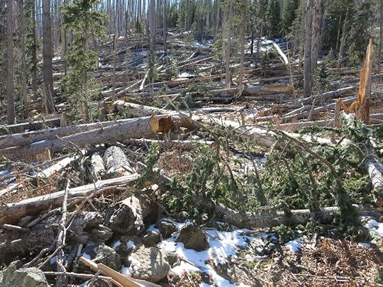 After a quarter mile or so, I left the intact forest and entered the burn scar, and the deadfall got really bad. Had all these trees really fallen since mid-October, when the last trip report claimed it fully cleared? It was hard to believe.
