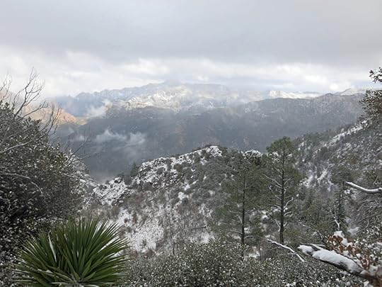 I love the way snow transforms everything in the environment, and of course I had a front row seat here – this snow had just fallen, I was the first to experience it. At least four inches had fallen during the past hour and a half – my ascending footprints had been completely obliterated. Lots of animals had crossed the trail since morning – javalina, deer, bobcat – even a fox chasing a rabbit.