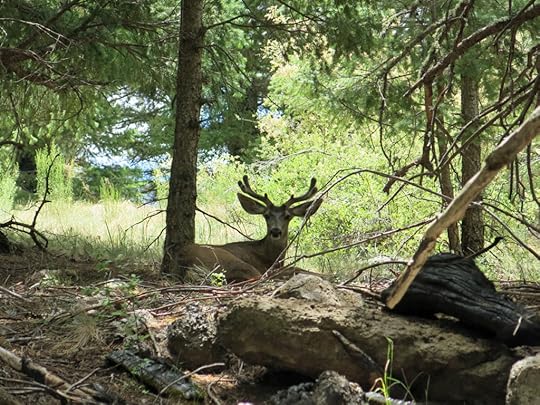 The flowers were less spectacular than a month earlier, and the big butterflies had been replaced by swarms of little butterflies. When I reached the trail junction at the peak, in its rain forest-like habitat of old-growth firs, lush grass and tall ferns, I noticed something out of the corner of my eye. It was a buck deer, youngish, lying down in the shade of the firs, about 40 feet away. He watched me without moving – he’d found the perfect resting place on a hot day and wasn’t anxious to give it up.