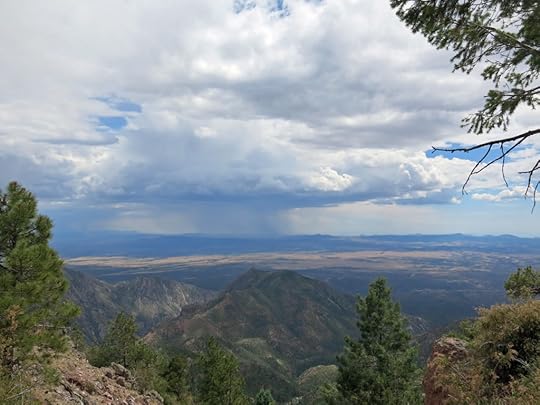 As I climbed the switchbacks toward the crest, thunder rumbled from within a dark mass of clouds to the southeast. The illegal cattle I’d surprised in the canyon a month ago had continued to follow the trail upwards, leaving their pungent cowpies on the trail and attracting flies that swarmed my dripping face.