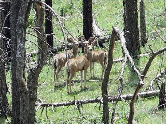 White-tailed deer were everywhere, and red-tailed hawks soared through the tall firs and wheeled around summits. The hunting dad had mentioned a fire over in the Blue Range primitive area, to the northwest, and after returning to my vehicle and driving down out of the foothills, I could see the long plume and then a billowing cloud rising above the tallest peak of the range, dozens of miles away. When will this fire season ever end?