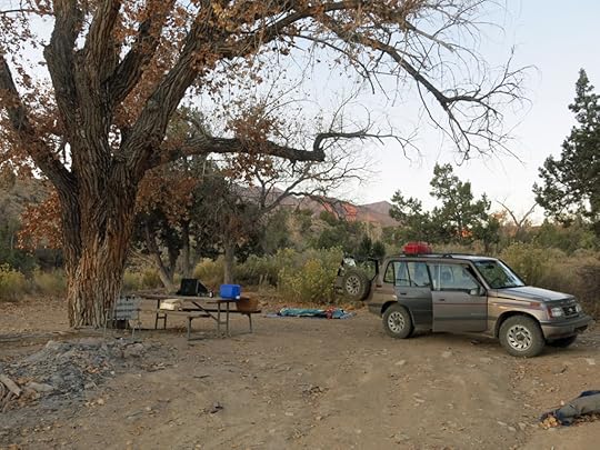 We began the long hike back to camp, with me complaining angrily along the way, and pushing myself to walk too fast with my short steps. Fortunately we came across an old roadway that we’d missed on the way up, and it gave us a much easier path to camp that turned my attitude around. There was still a bit of light left in the sky when we finally arrived, and I raced to take a shower, with my water bag perched atop the spare tire mounted on the Sidekick’s dusty tailgate, before starting dinner.