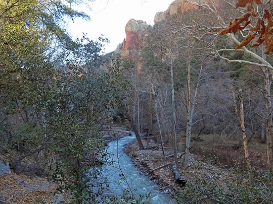 There were snowstorms in the mountains over Thanksgiving, and more a week later. As the weather warmed after that, I discovered the creeks were too flooded with snowmelt to cross in many places, and the snow too deep and crusty to trudge uphill in. But the weather stayed warm and I was hoping I could get in one more hike up my favorite trail before more snow made it impassable.