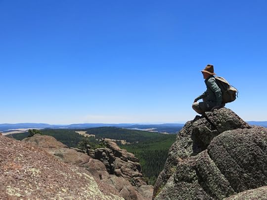 I drove up about a thousand feet, with spectacular views all the way, then topped on a rolling ledge forested with pinyon and juniper, with pulloffs to undeveloped campsites on each side. There was standing water in the roadside ditches – it must’ve rained last week – but the clay road itself was dry and hard as rock. I could see the twin peaks up ahead, and after a few miles, the road began climbing again, to a notch between them. Passing through it, I looked down across the ridge proper, a high, rolling plateau of alternating sagebrush meadows and mixed pine and fir forest that stretched dozens of miles to the horizon. The peaks were roughly 9,000′ elevation and the ridgetop plateau was roughly 8,500′.