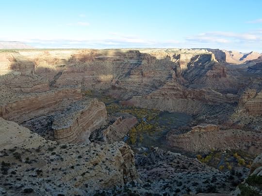 Stopping at museums, sidetracking for rock art, the short day was being chipped away at. I was approaching an interstate highway; if I took it west, there’d be many hours of driving through country I’d already seen, with little or no opportunity to camp, and I’d probably end up in a motel again. Alternatively, I could keep going on this rural highway, into a part of Utah I’d never seen. I spotted a grove of golden cottonwoods beside the road and pulled over to make a sandwich on the tailgate of my truck.