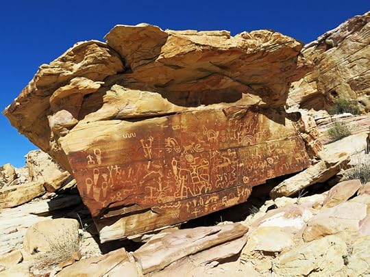 The Indians made it quite clear that this is NOT ART – a paradigm shift I should’ve been prepared for. A Native American friend had given me LaVan Martineau’s book The Rocks Begin to Speak thirty years ago. Martineau, who learned from Paiutes, claimed that rock markings represented a universal sign language, a medium of communication, not an art form. But I’d either forgotten about that, or allowed my thinking to get lazy in the intervening years. Poor LaVan doesn’t even have a Wikipedia page, which makes me feel better about not having one.