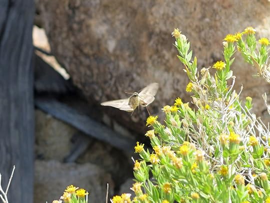 Leaving the hawks to their love affair, I started walking out across the bajada, down into gullies, up onto rises, and around shrubs and cacti, and made it about 2/3 of the way to the boulder pile before my foot began to get tender and I knew it was time to turn back. So frustrating! Despite the drought, there were both annuals and perennials blooming, phainopeplas were active everywhere, and I encountered hummingbirds near camp, but couldn’t get my camera to focus on them.