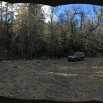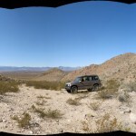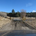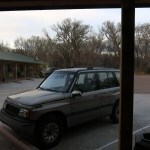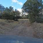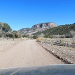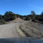 But today’s challenge turned out to be the approach road. This is a dirt road that gets very muddy after any precipitation. There are actually two parallel roads that start at the same place on the highway, separate, then rejoin 3 miles later. I took the left-hand road that climbs a low ridge, figuring I might return on the other road. The left-hand road turned out to be one of the two gnarliest back roads I’ve ever driven in this area, at the very limit of what my 4wd Sidekick can currently handle. Big trucks had driven it in the mud, digging holes up to a foot deep, and the rocky part really had me worried since my tires are nearly bald.