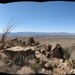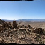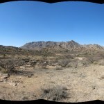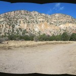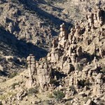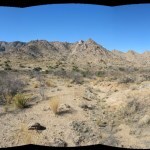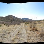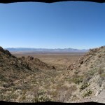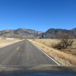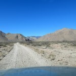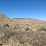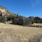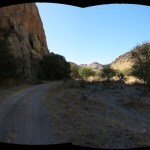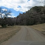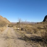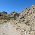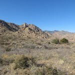 It was another day without clouds, temperatures forecast to reach the 50s. Under full sun it would feel much warmer, if not for the steady west wind I found to be blowing all day. The ranch road in was very well-maintained, but my eyes were constantly drawn to the fantastic rock formations it twisted between, and I stopped every hundred yards or so for pictures. It was all even better than I’d expected – after cresting a low rise, you wind down into a hidden basin surrounded by low hills to the south and spectacular mountains, cliffs, and pinnacles in the west and north.