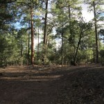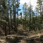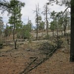 The hike begins at 7,200 feet elevation, at the eastern foot of a long east-west ridge, in the narrow, pine-forested canyon of a seasonal creek. It traverses through pleasant, open ponderosa forest thinned by a 2020 fire that started at the west end of the ridge and mainly burned on the crest and the north slope – but surprisingly sneaked around to burn at low intensity at the southeast end.