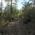The side road I found had a barbed wire gate made with tree branches and was clearly seldom used. The map gives this trail a number, and an online search leads to a Forest Service trailhead page, but there’s absolutely no other information online, which is what I prefer. Closing the gate behind me, I drove across a steep slope into a narrow canyon under big ponderosas, reaching the next turnoff in a few hundred yards. This led up a steep grade on a very rough and rocky track. The track continued over the crest of a ridge, but I parked at the top, figuring the trailhead was only a few hundred yards farther.
