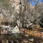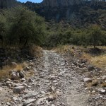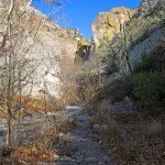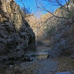 In the middle of a paragraph describing the beginning of the trail, the author of the online guide mentions that if you leave the trail at the first creek crossing and bushwhack two miles up the side canyon, you might be able to reach a waterfall. He added, “Note that it can be quite a rugged off-trail hike to get to the waterfall, especially after flooding has rearranged the area significantly and brought a lot of debris into the canyon.”