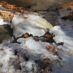 Creek lined with lovely, thick ice from recent temps in teens. Much more water than I expected, runoff from sun on snow and ice higher up. Fall color lingering on fallen sycamore leaves. Magical place.