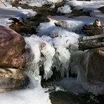 Tricky creek crossings on icy rocks between frigid pools a foot deep. Trying out trekking poles in hopes they’ll help my knee – they help in creek crossings but are awkward on this rocky trail and useless and in the way in many places.