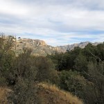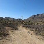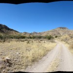 Up and down across side drainages, the road gradually took me higher above the basin, yielding better and better views. I found the fairly recent track of a single hiker who must’ve been about my size. I came upon modest ranch infrastructure, and mused enviously that this must be one of the prettiest ranches in all Arizona.