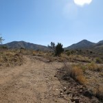 What I found was a rough ranch road that led to a corral and water tank at the mouth of the canyon. After closing the gate behind me, I was only able to drive a few hundred yards before hitting the sandy crossing of a big wash where my 2wd truck would surely bog down, so I parked in a clearing, loaded up, and starting hiking the road. At 1,400 feet lower than home, it was already warm enough that I had to unbutton my shirt.