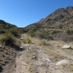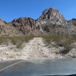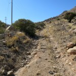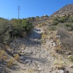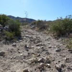 I set off up what was left of the road. It soon ended – without space to turn the Sidekick around, so I was glad I’d stopped early. Here, floods had left a wall of rocks above the wash, but I could see some kind of narrow, overgrown corridor leading up to the right of the rock wall. I tried to follow what looked like an old mule trail, but in many places it was choked with cactus.