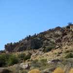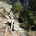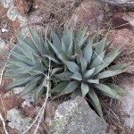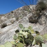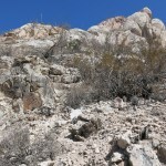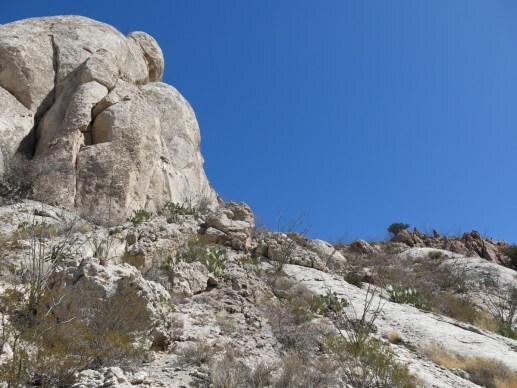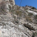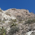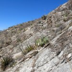 I immediately discovered this was dangerous terrain to climb – as dangerous as that plateau hike I make in the Mojave, with the same features. The slopes here were loose dirt and loose rock alternating with steep ramps of rough bedrock, and the way was blocked again and again by shrubs with inch-long thorns, prickly pear, and big agaves that would impale you if you happened to slip on a loose rock.