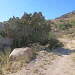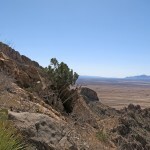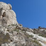 So I turned right, where across a rockfall of sharp boulders, I could see a long, steep bedrock ramp leading up to the horizon, where there appeared to be a juniper beckoning me. I picked my way carefully over the boulders, and stepped out onto the ramp. The surface was like a really coarse carpenter’s rasp – a fall would tear your skin off down to the bone, and sand your bone down to bone meal. Traction was really good for climbing up, but how would I get back down? I blocked out the thought.