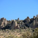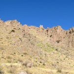 Cattle had used the road, but only rarely, and the most recent cowpies were a couple weeks old. I spotted a herd lounging a half mile north near a corral and water tank. Another hike I’d considered follows a dirt road that branches south, offering a possible route to the summit of the range. But when I reached that branch, I could see that the southern part of the range doesn’t feature those spectacular rock formations, so I kept going on my powerline road, forcing myself to move at a leisurely pace and take shorter steps than my body seemed to want to.
