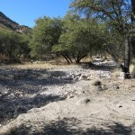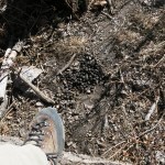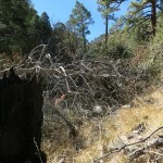 I was surprised to come upon an old wickiup frame above the creek with a stone campfire windbreak, apparently built long ago by someone experimenting with the old ways. It’s great other civilized people are doing this, but when it’s only a one-time thing, we should return the site to its natural state instead of leaving ruins like this.