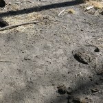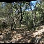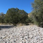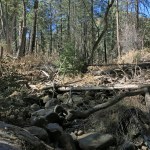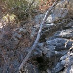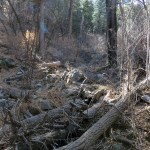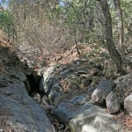 I’d gotten a late start and it was already in the mid-60s here, so I was comfortable in my long-sleeved shirt. Initially, I found the oak forest free of undergrowth but lined with embedded rocks, and for a short distance I could follow a vague trail that appeared to have been used mostly by the occasional enterprising bull. I also noticed partial tracks of another recent hiker that I continued to find farther upstream, until the going became too rough for my predecessor.