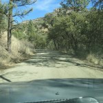 I tried the other road on the way back, and barely made it. At the halfway point, the other road plunges down the bank of a 20-foot-deep creekbed, which would definitely wash out in our monsoon. Just as I prepared to drive down that bank, a big redtail hawk launched off a branch at my right and flew left down the creekbed carrying an adult Abert’s squirrel suspended from its claws. Second time I’ve come upon a hawk carrying a squirrel.