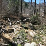 The forested lower canyon widened out, big ponderosa pines appeared, and the cattle trail led away from the creek. I entered patches of burn scar, and expanses of exposed rock where algae was choking the creek.