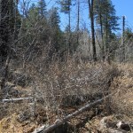 Deadfall, blowdown, and thorny regrowth blocked the trail almost continuously, and in several cases had to be detoured around. I was only able to fight my way through because enough tread remained for cattle to follow – there was no evidence of other hikers going this way since the fire, and the cattle had become my trailblazers.