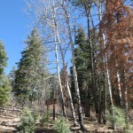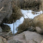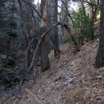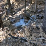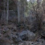 Staying near the creek now, I clambered over sharp boulders and fought my way through more deadfall and thickets, past more snow patches and frozen creek. Suddenly, I realized I was surrounded by white aspen seedlings, standing like ghosts in the deep shadow of the crest above. I love aspens, but I hadn’t expected to reach their habitat on this hike – from my glance at the topo map that morning I figured I would only be climbing a thousand feet or so above the oak zone.