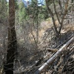 As the canyon narrowed, the ridges above literally towered above me so that I was in shade much of time, and big firs – many of them three feet in diameter – began to outnumber the pines. The creekbed was dry for long stretches but always reappeared farther up. My toil up the canyon became truly epic – the creekbed was almost everywhere jammed with fallen logs, there was no floodplain, and the steep slopes to each side consisted of loose rock – talus – sometimes exposed, and sometimes covered by dense thickets of thorny locust and stiff-branched scrub oak. I stumbled often and fell many times, but was always able to catch myself without injury.