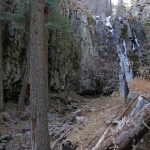 I lingered in this cold, dark, beautiful place long enough to log a waypoint with my GPS message device. I was surprised to be able to connect with a satellite, down in that dark canyon. But when I checked the coordinates against the topo map back home, I found the satellite had recorded my location one third of a mile off – the cliffs and solid canopy of firs had apparently deflected and/or reflected the signal more than I would think possible. GPS users, be forwarned!