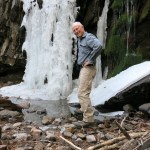 Suddenly, through a gap in the black tree trunks, far in the distance I spotted scraps of brilliant white. I approached slowly and carefully across the steep talus, made slippery by a layer of fir needles, until a frozen waterfall, fifty feet tall, began to reveal itself, gradually as if to increase the suspense, around a bend in the canyon wall.