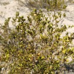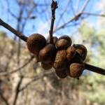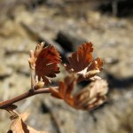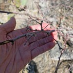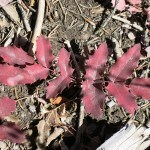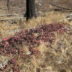 As usual, on the way back to the trailhead I paid more attention to details of habitat. I was particularly impressed by the color range of a native ground cover with holly-like leaves. I’d surely seen it before, but in this winter burn scar it was the most colorful thing in the landscape. And although this range doesn’t have much exposed rock, the loss of trees had revealed strange, isolated, stratified dolmen-like outcrops.