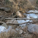 From here on, deadfall, flood debris, and thickets of thorny locust and other shrubs made the canyon bottom and neighboring slopes increasingly difficult, slow, and often painful to navigate. I looked for cattle trails, but they always led upslope away from the creek. The creek itself was becoming so choked with debris that following it was often impossible.