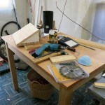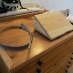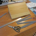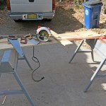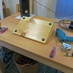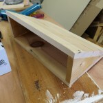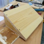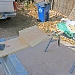 I had a length of pine one-by-twelve that would be easier to work with and make a nicer item than plywood. I hadn’t used my table saw in a couple years, so I was stoked. Happily, this wee project ended up using all my basic power tools, and mild weather allowed me to use the concrete slab right outside for sawing and sanding that would generate sawdust. I spent about four hours designing, cutting, and gluing the pieces together.