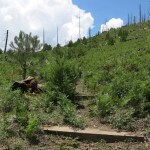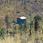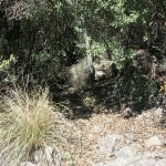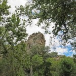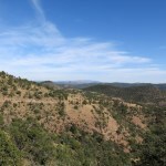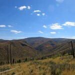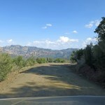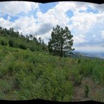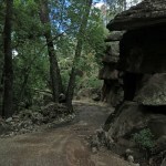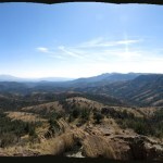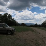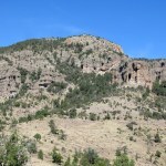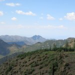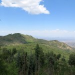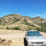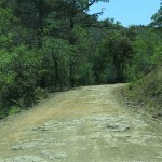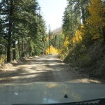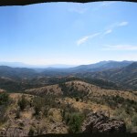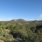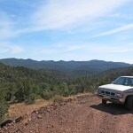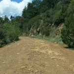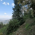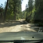 It was a beautiful drive on a spine-hammering road starting out as deeply washboarded gravel, rising in single-lane hairpin turns on hard-packed dirt, rocks up to two feet in diameter embedded in hard-packed dirt, and ledges of solid bedrock. It took forty-five minutes to drive the ten miles to the crest. I passed several deer, and in a shady grove in the foothillls, a group of kids on an outing supervised by two women. But I didn’t pass another vehicle all morning on that narrow, twisting road.