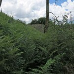 The crest trail starts at the parking area outside the campground, and climbs through a fern-covered burn scar. It was hot out in the open – probably in the mid-80s. The trail traversed above and around the campground, and nearing the actual crest I came to a side trail, and followed it to a small saddle where I got my first view west. Clouds were building over the mountains south of me, and the west looked stormy.