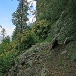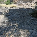 Farther down, descending one of those stone sheets lined with loose rock, I finally stumbled and had a “soft” fall that hurt nothing but my already injured knee. Served me right – I would just end up taking more pain pills and enduring a slower recovery.