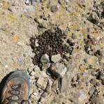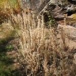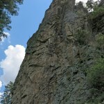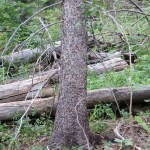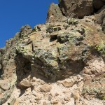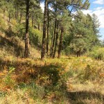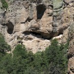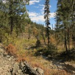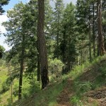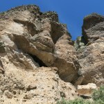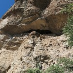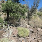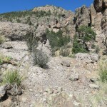 The ledge lies at 7,500 feet and the ravine at my left hosts tall ponderosas and a dense understory of shrubs and grasses hiding bigger and sharper rocks – basically a vegetated talus slope. I had to traverse this upward at the foot of the bluffs – more slow going – but found occasional segments of a narrow trail. I’d entertained fantasies of being the first modern human to explore this site, and still hadn’t seen any footprints.