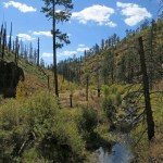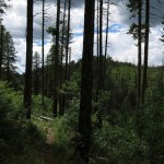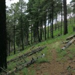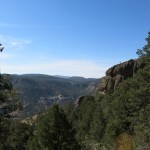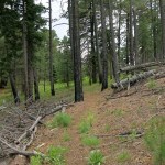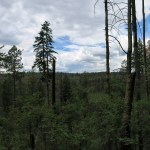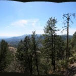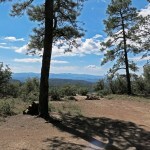 Winding beneath the big trees, it took me to a campsite on the edge of a rock cliff overlooking a broad thousand-foot-deep canyon toward the distant skyline of our 11,000 foot mountains thirty miles away. It was the most spectacular campsite/picnic spot I’d ever found in my home region. It was litter-free and someone had left a little stack of firewood. I even found a young Arizona cypress growing on the rim, a tree I’d never seen in this area.