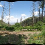 I rejoined the main trail, which continues traversing across the east side of the crest, through patches of shade and thickets of thorny locust, and onto a narrow ledge below a sheer cliff. Past the cliff, the trail curves back into a hollow where I came upon an older couple struggling to control two big dogs – the people from the RV. Patches of forest and burn scar alternated across the slopes, jays and woodpeckers flitted through the trees and snags above me. Eventually the trail reached a saddle on the crest. I’d intended to turn back here, but there wasn’t much of a view, so I kept climbing.