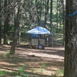 I was thrilled to reach the crest, to cross the watershed and glimpse the eastern landscape, the mountains I was familiar with from many previous trips. Here a side road continues a thousand feet higher to a campground in the sky. I drove below tall firs that emphasized the altitude – everywhere there was a feeling of being on top of the world. I passed some kind of official crew camping at a dispersed site in a grove of giants below the road – they were gone when I returned in the afternoon. At the 8,400-foot campground I saw one RV, but apart from me and these there wasn’t another vehicle on the mountain. I parked, breathed the clean high-elevation air, and ate the tacos I’d picked up on the way.