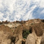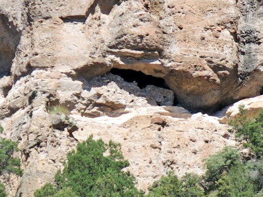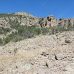 Picking my way through those rocks was even harder than I expected. But cattle had been all over this area, and I followed their tracks where I could, walking slowly and carefully to protect my knee. At several points I had to climb steep sheets of exposed bedrock, lined with loose rocks that were constantly rolling out from under me. I was ascending an outlying shoulder with a deepening ravine at my left, and I could see that when I reached the foot of the actual bluffs I would need to traverse left up the steep side of the ravine toward the cliff dwelling.
