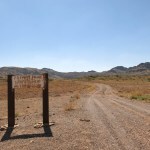 The map showed two roads leading to the wilderness boundary at the foot of the mountains, one branching off from the other. I continued straight without ever seeing the branch, the road getting rockier, showing only one clear tire track. Eventually I reached a No Trespassing sign. There was no gate, and I see could see the road ahead cresting a rise, so I continued to the rise to see what was beyond.